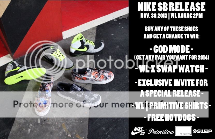 It's a triple threat we Legendary Saturday with the release of DJ Clark Kent x Primitive x Nike SB "112" collection, Janoski "Floral" re-stock and we Legendary x SWAP launch! Plus free hotdogs for everyone, music by DJ Tong and the D12 finals.