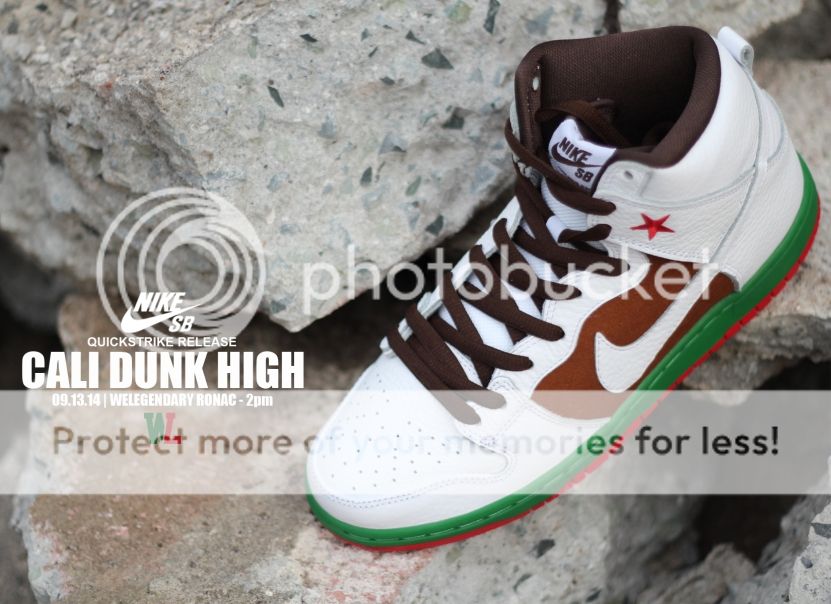 About half a year after Nike released the Nike x Diamond Supply Co. SB Dunk High "Tiffany", the Swoosh blesses us again with another re-imagine of a highly sought after Nike SB classic, the Nike SB Dunk Low "Cali." Originally released 10 years ago and inspired by the 31st state, the shoes feature all of the elements found on the flag, paying homage to the birthplace of skateboarding. From the bear (pecan suede panels) to the green midsoles (grass) / red outsoles (stripe) and star, Nike does not disappoint with this high top version.