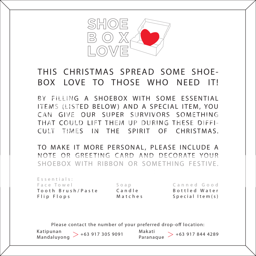 My partner in crime in The Powder Room, Margaux and I would like to do this again this year, to bring some Christmas cheer to survivors of Yolanda. It will be a month long collection so there's plenty of time to make your boxes and spread the word and if possible, please fill with the following: